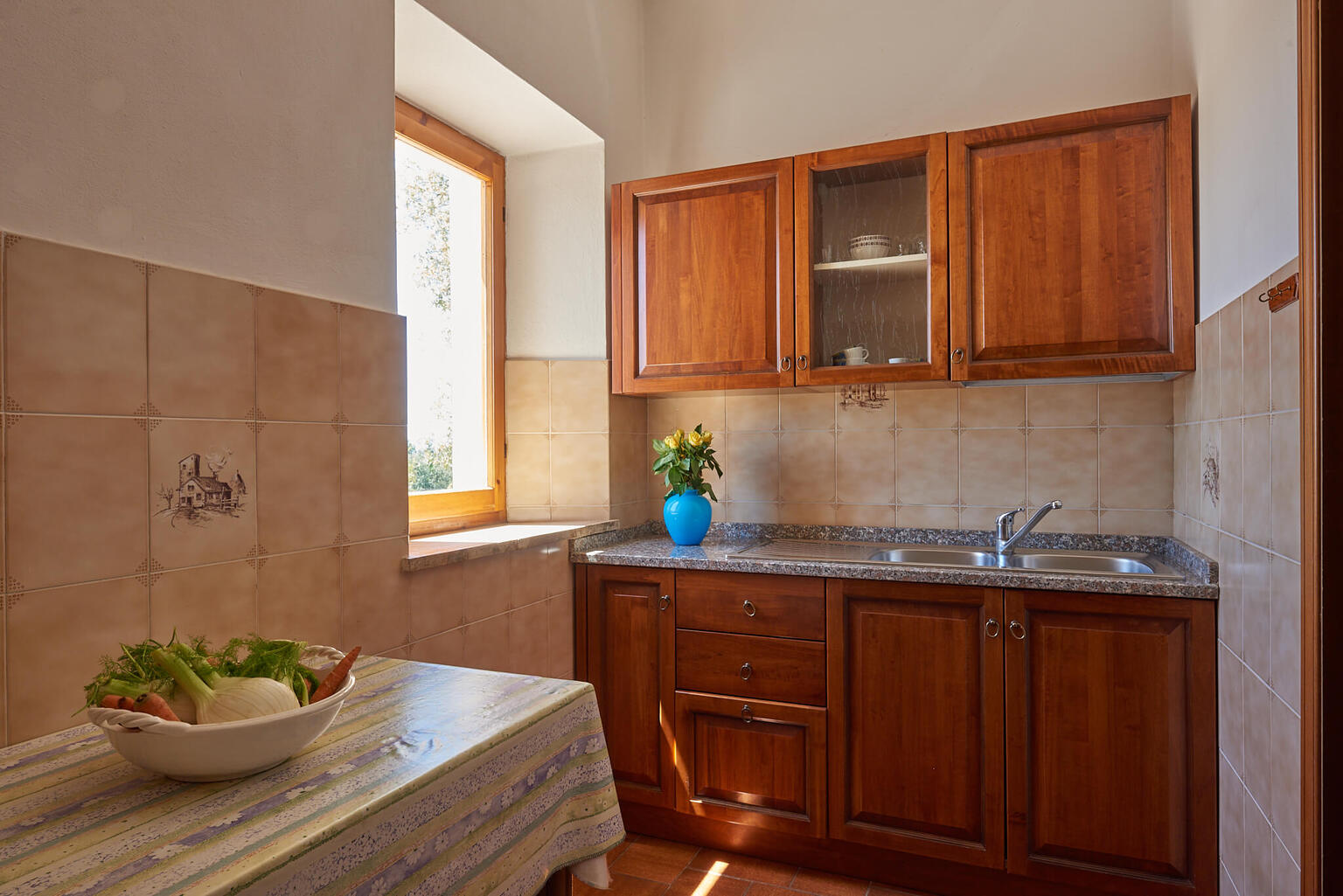 Det finns ett sovrum med dubbelsäng, totalt utrustat kök, vardagsrum och badrum. Inredningen i rustik stil och stenpartierna på väggarna ger lägenheten en speciell karaktär som brukar vara mycket uppskattad bland våra gäster.