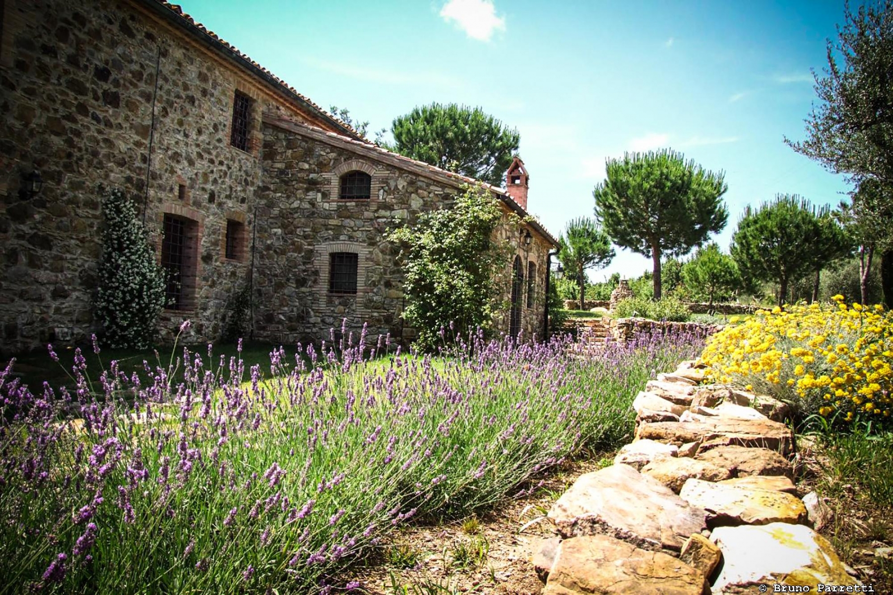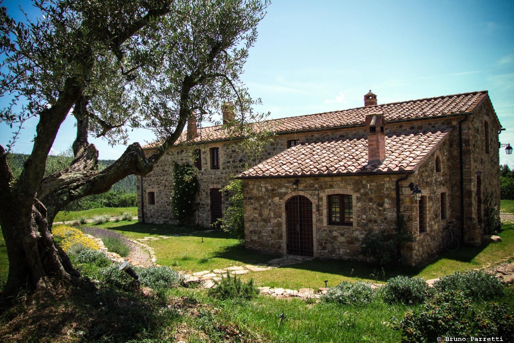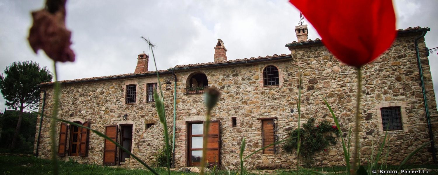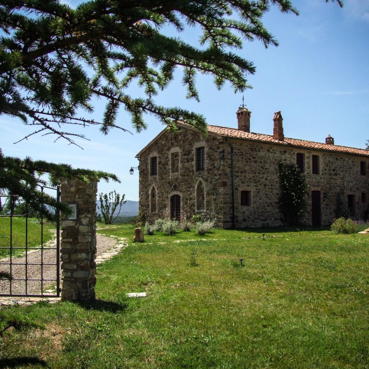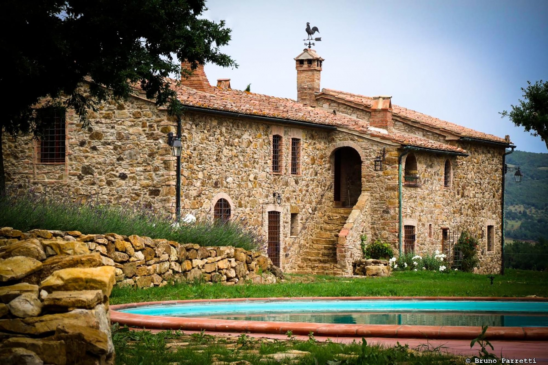 Den har varsamt renoverats för att behålla så mycket som möjligt av dess ursprungliga karaktär. Även den stora trädgården med pool är formgiven av arkitekt som skapat olika trädgårdsrum. Hela platsen är mycket vacker, en riktig idyll med härlig utsikt över de gröna kullarna och det toskanska landskapet runt omkring.